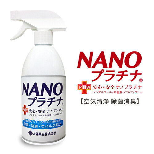 特徴 92%の医師が推奨!【NANOプラチナ】 【長時間抗菌・NANOプラチナの8つの特徴】 1・お部屋の抗菌・防カビ・消臭に! 2・加湿器タンクのヌメリ防止! 3・タンクの中の防カビ・除菌・消臭! 4・タンクの水の半年間の持続抗菌テスト合格! 5・加湿式で布団やカーテンや衣料品の消臭・防カビ! 6・無香料・無臭・無刺激(安全性試験すべて合格)! 7・防腐剤無添加・安心安全・ノンアルコール・パラベンフリー・弱酸性・非塩素(非次亜塩素酸・非カルキ)! 8・花粉対策やペット臭、生ゴミ・トイレ・お風呂場・タバコ臭などの消臭・除菌・防カビ・ウイルス除去に! 成分:【無香料】白金、精製水、その他 【防腐剤無添加】安心安全 ※ノンアルコール・非塩素・パラベンフリー・弱酸性 容量:500ml 生産:日本製 太陽薬品株式会社 【特許取得・プラチナシールド技術の特徴】 塩素やアルコールを使用せず長時間の抗菌・ウイルス除去・消臭効果を可能にしました。